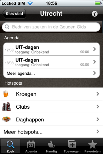 Ben je in Den Haag, Leiden, Groningen, Amsterdam, Utrecht, Rotterdam of Delft, dan start ABN AMRO Student City Guide meteen op met de juiste gids; ergens anders, dan selecteer je in het eerste scherm zelf de stad. Het menu van elke studentenstad is ingedeeld in Agenda en Hotspots. De agenda is up-to-date met feesten en events zoals de introductieweken van de universiteit en hogeschool.